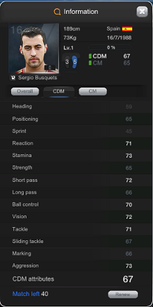 Pemain tak tergantikan di starting line - up Barcelona. Meskipun ia tidak memiliki atribut yang sangat baik untuk bertahan , teknik dribbling dan kemampuan untuk mengontrol bola ( Reaction ( 71 ) , Short pass ( 72 ) , Ball control ( 70 ) ) membuatnya menjadi pilihan yang sempurna untuk tim melakukan strategi Tiki - Taka.